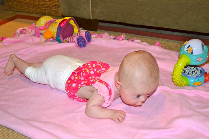Frances loves being on her tummy, and is able to lift her head up for a few seconds at a time.